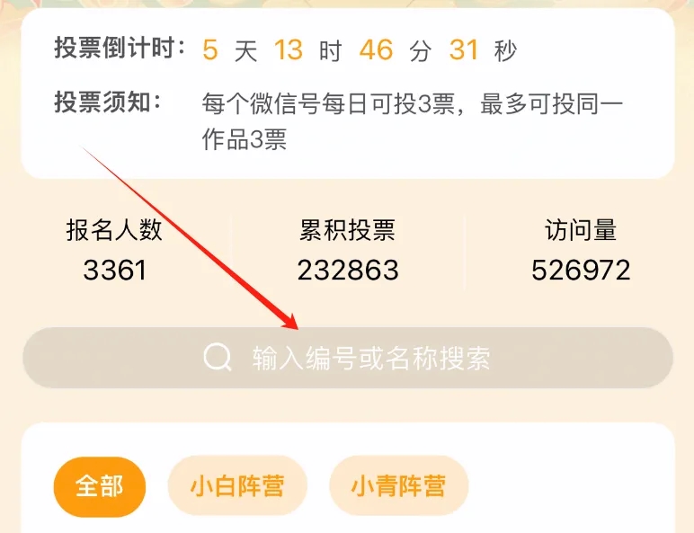 如果你已經(jīng)有支持選手的編號,也可直接在活動頁面輸入編號或者名稱,可直接跳轉(zhuǎn)到作品詳情頁進(jìn)行投票