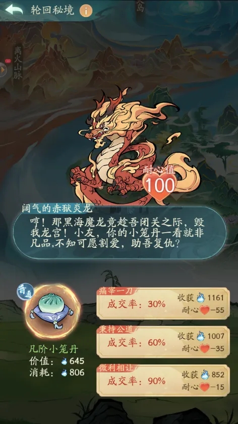 繼續(xù)歷練,道友將會(huì)遇到想要獲得寶物的“貴客”,不妨試著出讓,獲取更多氣運(yùn)。