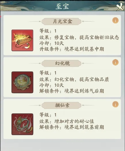 部分寶物的品質(zhì)和狀態(tài)不佳,道友可以通過解鎖至寶,修復(fù)寶物,提高寶物的品質(zhì)!