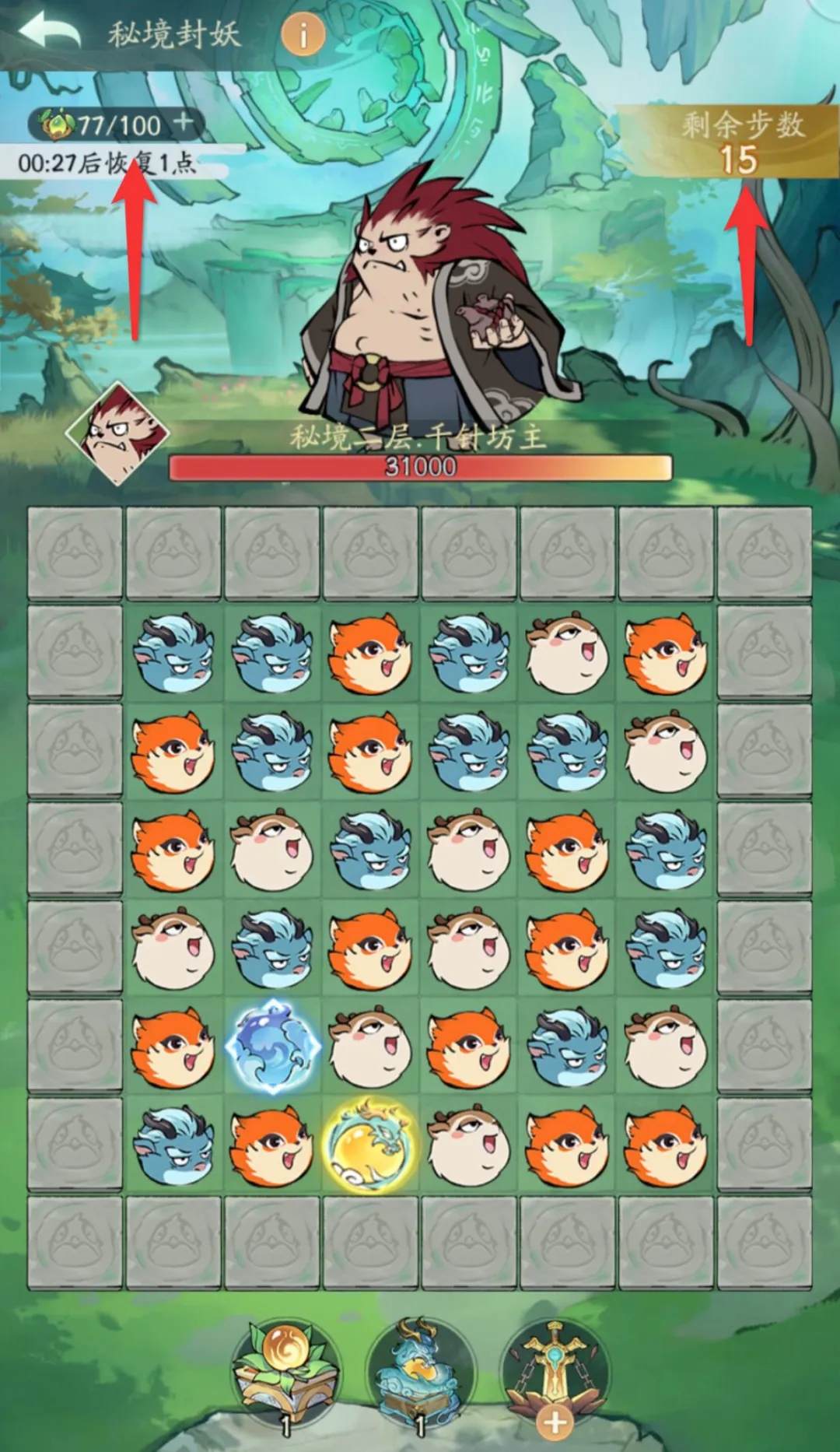 道友每進(jìn)行1次消除,會(huì)消耗1次步數(shù)和1點(diǎn)體力。需要在規(guī)定步數(shù)內(nèi)擊敗妖魔才可進(jìn)入下一層!