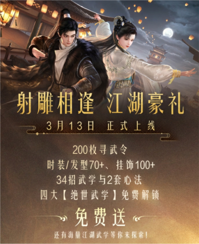為慶祝《射雕》2.0版本正式上線,200枚尋武令、170+套外觀、34招武學(xué)與2套心法免費(fèi)送!四大絕世武學(xué)免費(fèi)解鎖,還有海量江湖武學(xué)等你探索!每一位踏入江湖的玩家都不用有外貌焦慮、數(shù)值壓力,只需要玩得開(kāi)心即可。