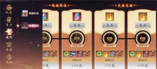 游戲的付費(fèi)界面很多,在商城之中我們可以看到每日禮包、每周禮包、大小月卡和永久月卡,以及進(jìn)階禮包中的英雄禮包,以上等等數(shù)不清的648禮包和高達(dá)16級(jí)的VIP等級(jí)。