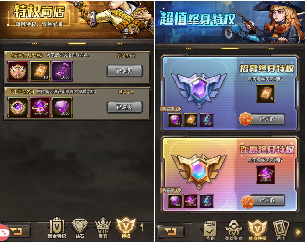 雙終身特權(quán)(98券×2):每日返利+永久戰(zhàn)力加成