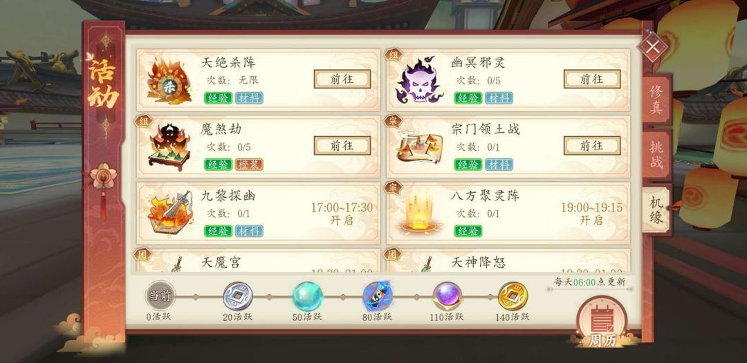 機緣部分的活動屬于限時活動,每個活動都有特定的時間要求,大家一定要注意限時時間哦!