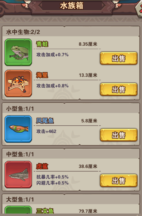 通過(guò)釣魚(yú)我們可以釣到不同品質(zhì)和種類(lèi)的魚(yú),分別為水中生物、小型魚(yú)、中型魚(yú)、大型魚(yú)以及特殊的收藏品;品質(zhì)和魚(yú)是對(duì)應(yīng)的,例如青蛙就只有綠品質(zhì)的,其中品質(zhì)屬性:紅色>橙色>紫色>藍(lán)色>綠色,由于水族箱的數(shù)量是有限制的,所以我們的目標(biāo)就是釣紅品魚(yú),越長(zhǎng)越強(qiáng)!