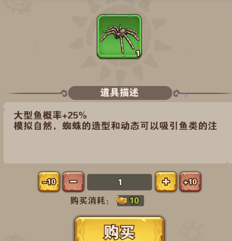 不同魚(yú)餌帶來(lái)的提升也是不一樣的,比較重要的是蜘蛛餌(大魚(yú)概率+25%)和幸運(yùn)星(增加藏品概率),主公可根據(jù)元寶庫(kù)存自行選擇購(gòu)買(mǎi)數(shù)量哦