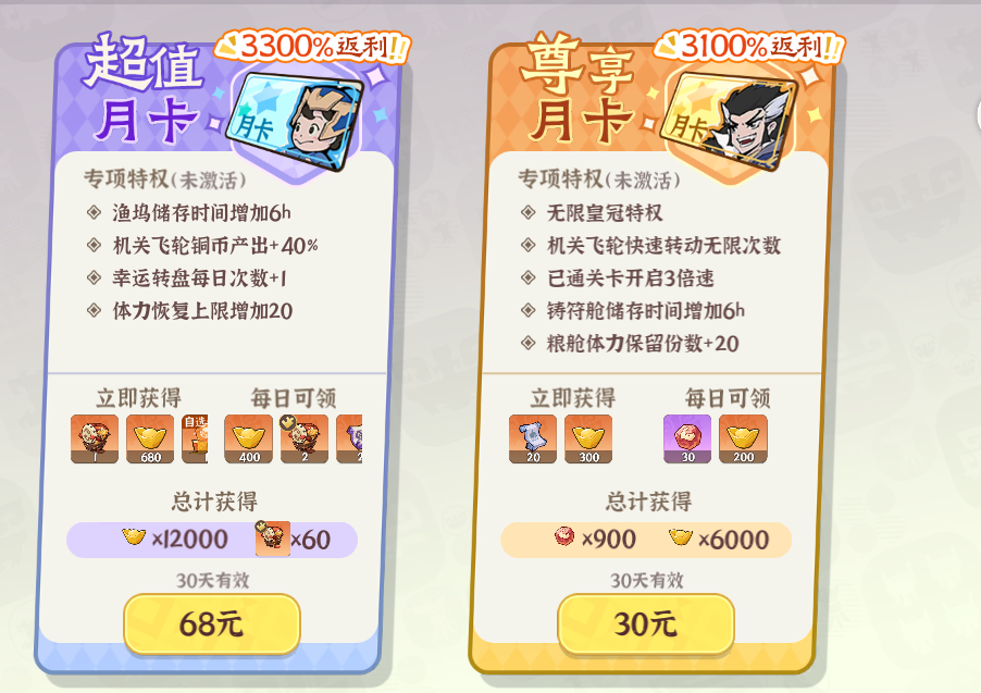 2.月卡&超值月卡:月卡和超值月卡不僅提供每日可領(lǐng)取的元寶和戰(zhàn)船藏品,同時還能夠加速戰(zhàn)斗和免除廣告;最重要的時,在前期體力溢出時,可以通過機關(guān)飛輪快速掃蕩領(lǐng)取大量養(yǎng)成資源,進度上快人一步