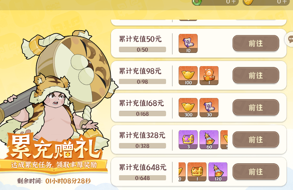 根據(jù)當(dāng)前累充額度距離下一檔累充獎勵的差值,可以選擇購買一些小額禮包積攢累充進度,白拿一檔獎勵