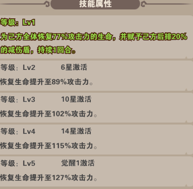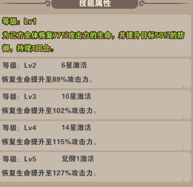 技能:全體恢復(fù)生命并提升防御(恢復(fù)生命石根據(jù)自身攻擊力結(jié)算的,所以攻擊力疊高),