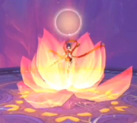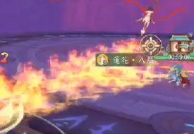 注:高傷AOE傷害,自身旋轉(zhuǎn)釋放一束連天火圈,狀態(tài)結(jié)束會有個插地結(jié)尾技能,此時,所有周圍玩家會被擊退??稍诨鹑磳⒔Y(jié)束時拉開距離。火圈釋放途中,可尋找攜帶蓮花之人,站在一起,降低所受傷害。