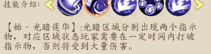 注:此技能其實(shí)就是BOSS攻擊類別,分陰陽,也就是光明與黑暗。黑暗為主攻擊傷害系。攻擊效果是光明與黑暗同時出現(xiàn),玩家躲避到白色【光明】光圈里時是安全的。在黑暗區(qū)域會損失一定血量。黑暗區(qū)域光圈也是雙圈重疊式,及時躲避即可。