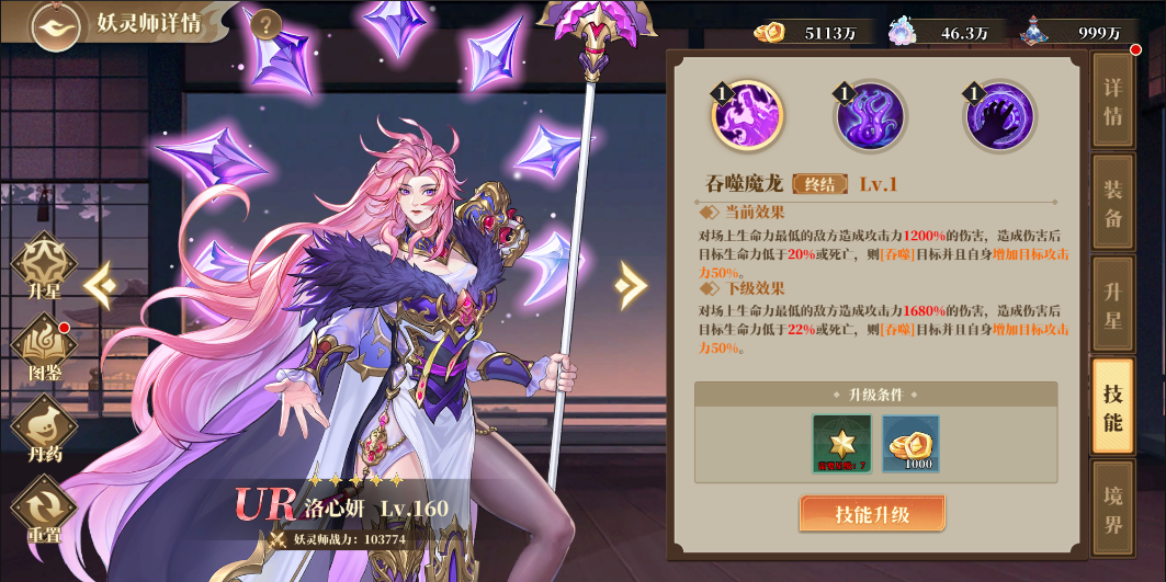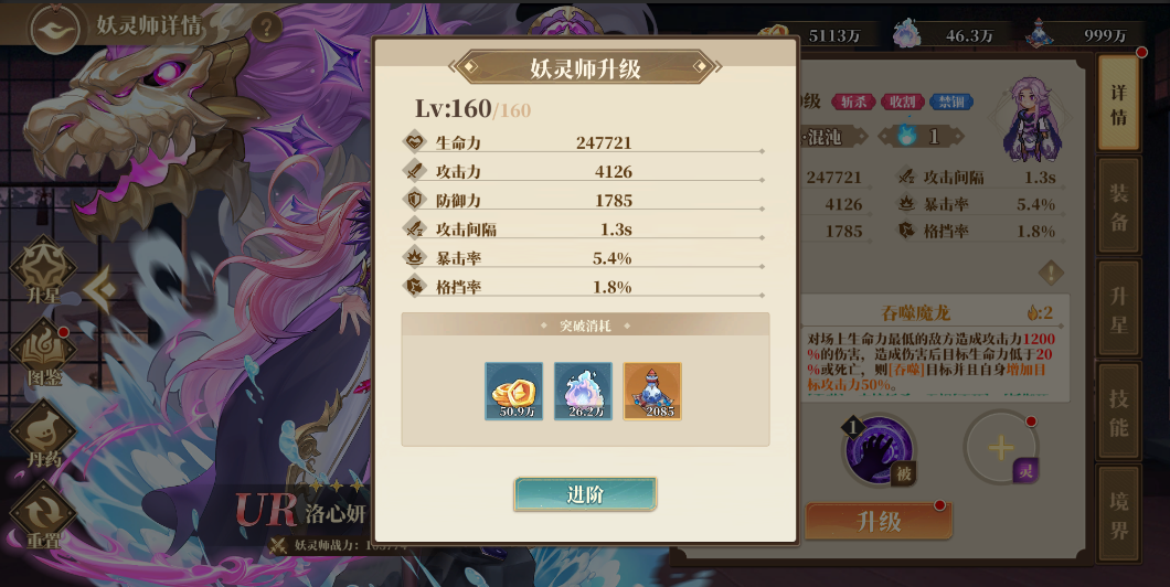 妖靈師可以通過消耗升級材料(妖晶幣、龍元靈液)提升等級,而升級可以提升面板屬性,當達到等級上限時可以通過消耗妖晶幣、龍元靈液和九轉丹進階等級上限。不過前期資源有限,還是盡量避免將養(yǎng)成材料分散給太多角色,練好一隊主力隊伍能過主線才是最重要的。?