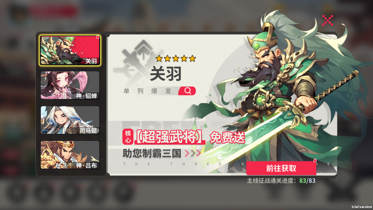 完成指定任務(wù)可得強(qiáng)力五星武將關(guān)羽、司馬懿、神·貂蟬以及神·呂布,助主公,制霸三國(guó)。