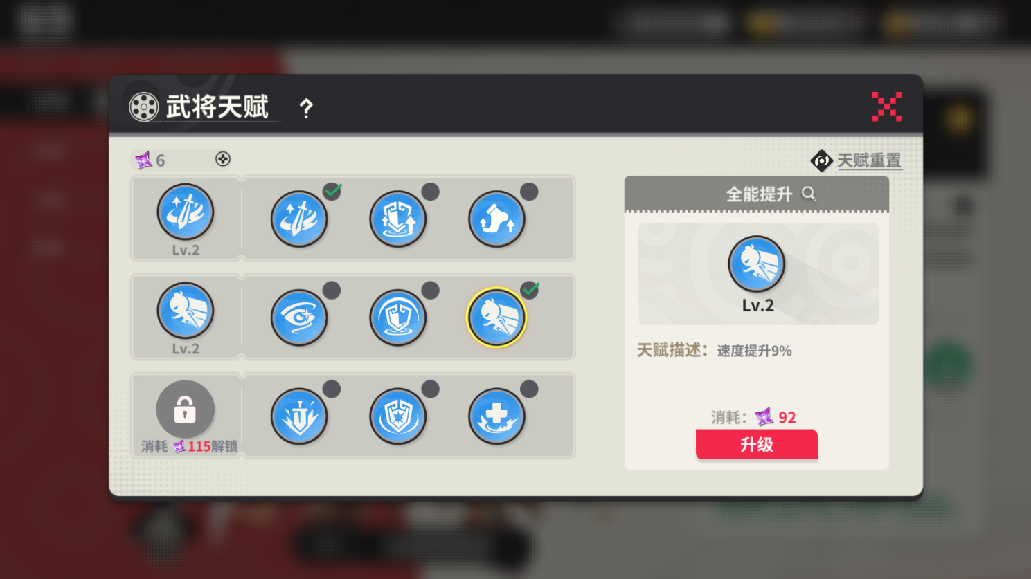 只有指定擁有武將天賦,根據(jù)武將星級(jí)解鎖武將天賦階級(jí);每個(gè)天賦階級(jí)擁有3個(gè)技能,通過消耗道具提升天賦技能等級(jí);天賦等級(jí)越高,增加的技能效果,技能屬性越高。