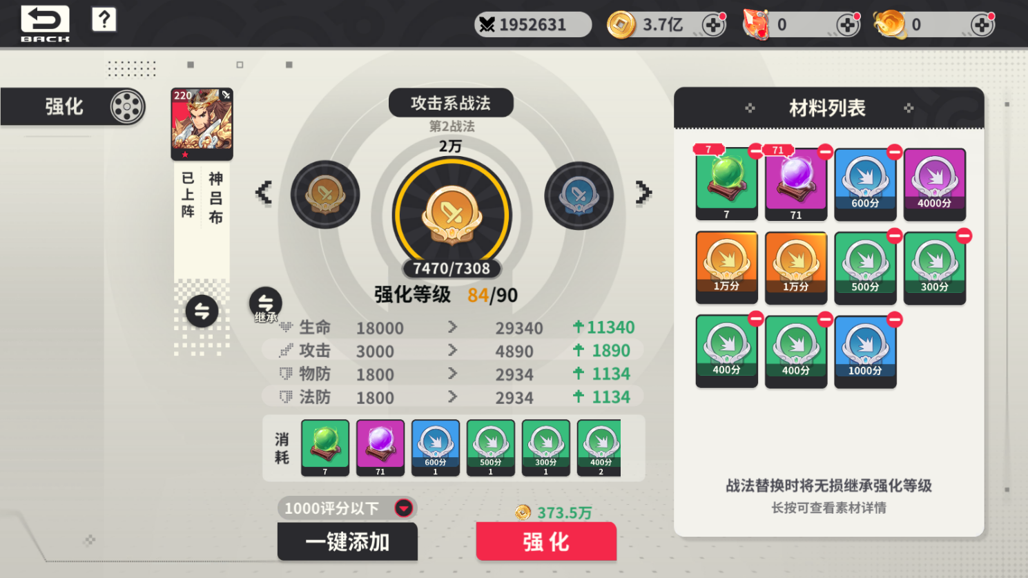 武將技能需要領(lǐng)悟戰(zhàn)法后激活,不同類型武將需要使用對(duì)應(yīng)的戰(zhàn)法類型,戰(zhàn)法可培養(yǎng)升級(jí),升級(jí)增加戰(zhàn)法基礎(chǔ)屬性;戰(zhàn)法評(píng)分大于或等于五萬分可傳承。