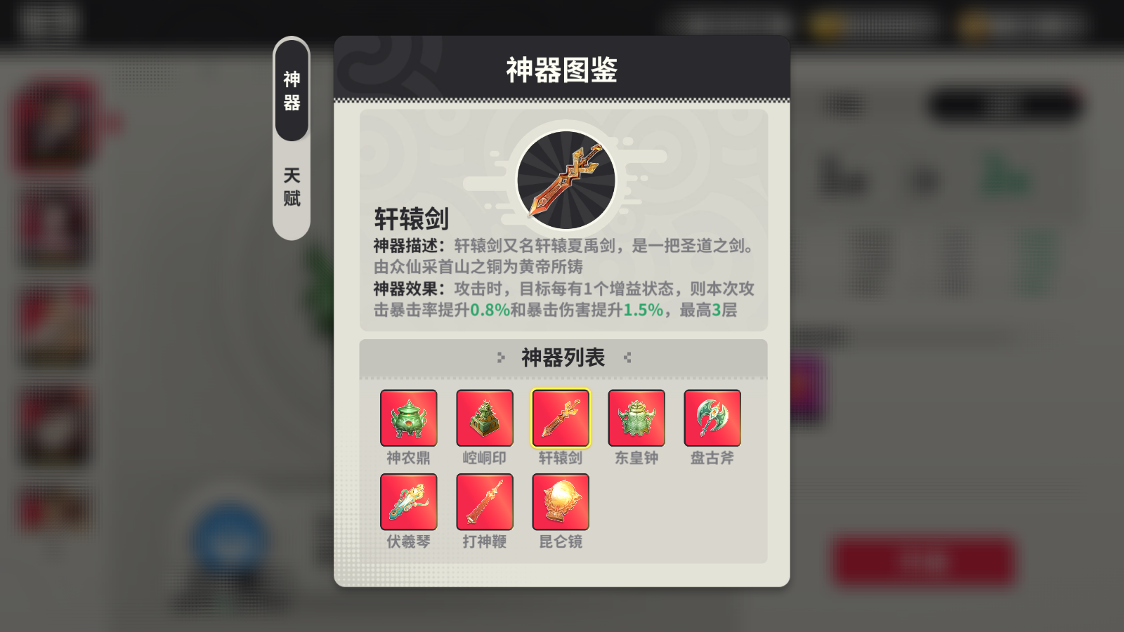 游戲內(nèi)有八個(gè)不同的神器,每個(gè)神器提供的效果都不一樣,主公可根據(jù)自身陣容選擇搭配,神器會(huì)佩戴天賦技能,可通過重鑄改變神器的天賦技能。